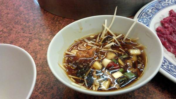 牛肉涮到顏色有變,就可以撈起來沾醬吃了